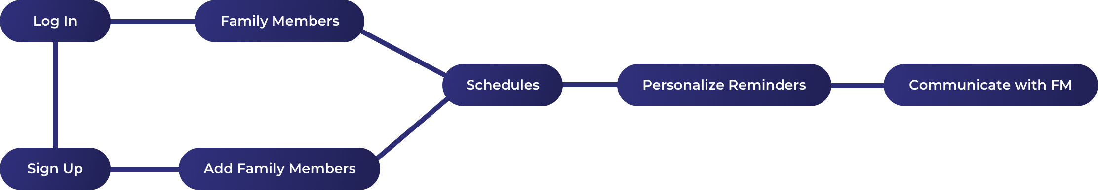 The app serves two personas: the “Caregiver” and the “Family Member.” The “Caregiver” would typically be someone over the age of 50 who has an elderly family member who needs to be taken care of. The “Family Member” would be that elderly person that needs to be taken care of.