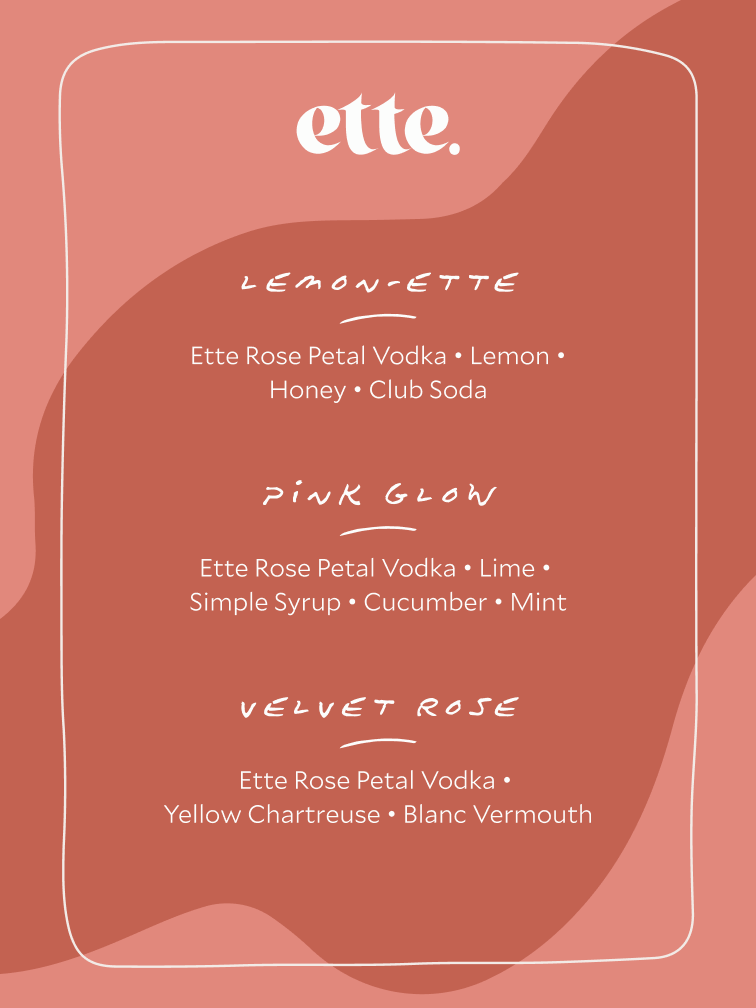 Ette is a floral vodka brand based in the NYC area made from hand-picked, one-of-a-kind ingredients that are blended with six-times distilled vodka to create a decadent floral taste that transports you with every sip.