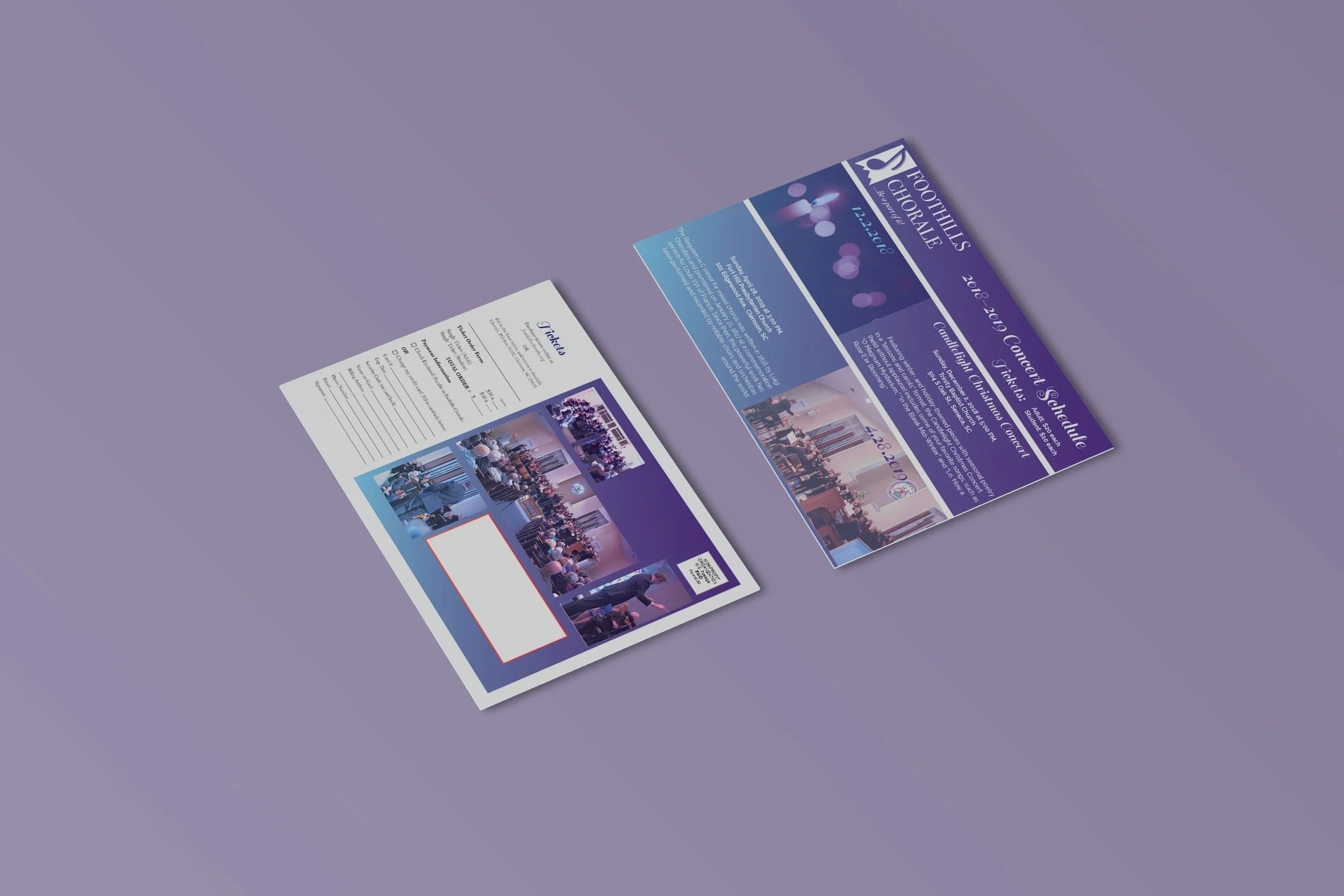 This postcard was designed for the Foothills Chorale, a local community consisting of vocal musicians from the Upstate of South Carolina, to announce their concert dates for the year.